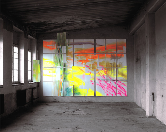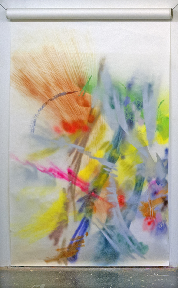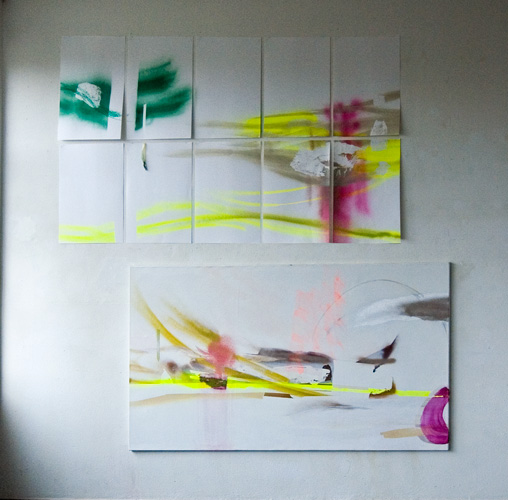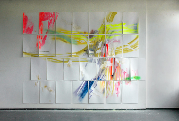 ![]() Atelieransicht 89,2°, Mischtechnik auf säurefreiem Papier, 2008 Format 287,5 cm x 155 cm links und 315 cm rechts, 24 Bögen á 70 cm x 50 cm |
