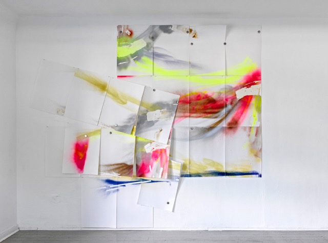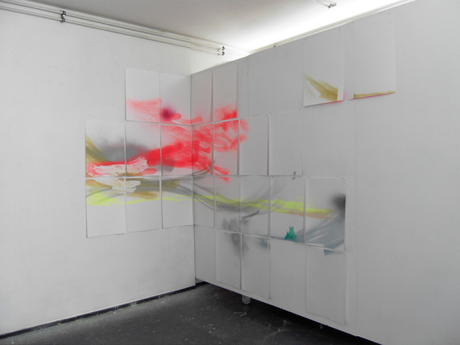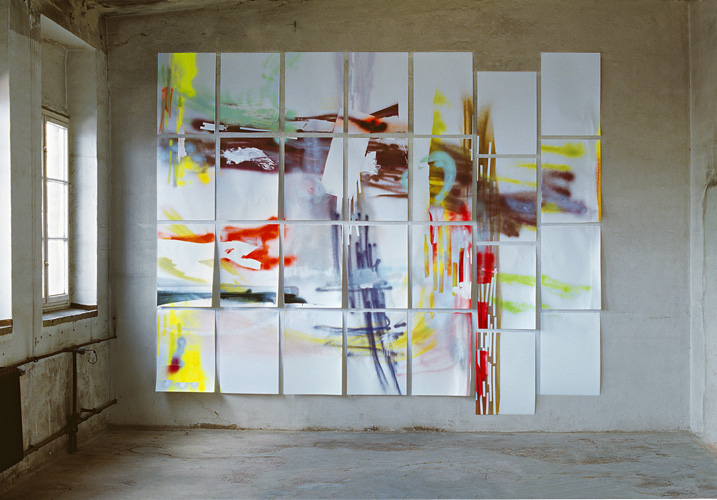 ![]() Ausstellungsansicht, Fragile, moments moving, Berlin Tempelhof, Mischtechnik auf säurefreien Papier, 2005 Format 305 cm x 374 cm, 28 Bögen á 70 cm, 50 cm |