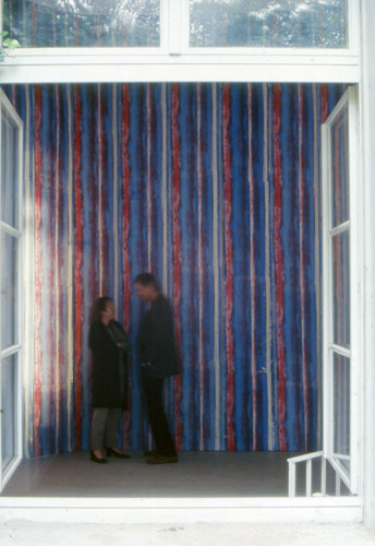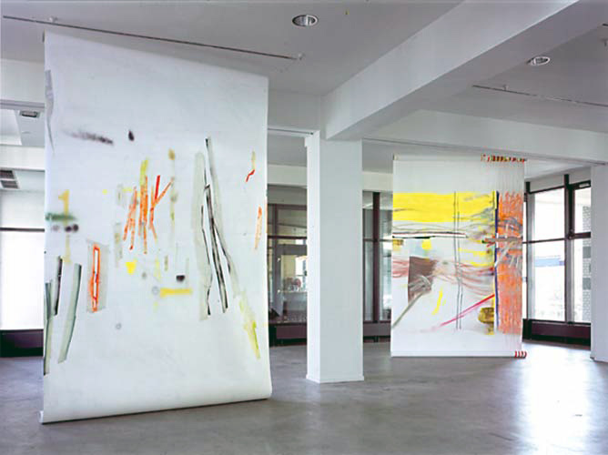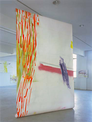 ![]() Ausstellungsansicht Trendwände, Kunstraum Düsseldorf, Mischtechnik auf säurefreien Papier, 2003 beidseitig bearbeitete Papierrollen, gezeigte Formate 386 cm x 248 cm |