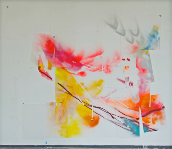 ![]() Ausstellungsansicht, Fluid, From dust till art, Berlin Tempelhof, Format 350 cm x 430 cm, 2004 Raum zwischen der Papierarbeit/ vorderen Wand ca. 900 cm, Mischtechnik auf Papier/ Wand |