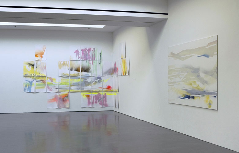 ![]() Installationsansicht o.T., o.T., Mischtechnik auf Papier und Leinwand, 2007 obere Papierarbeit 142,5 cm x 251 cm, Leinwand 130 cm x 240 cm |